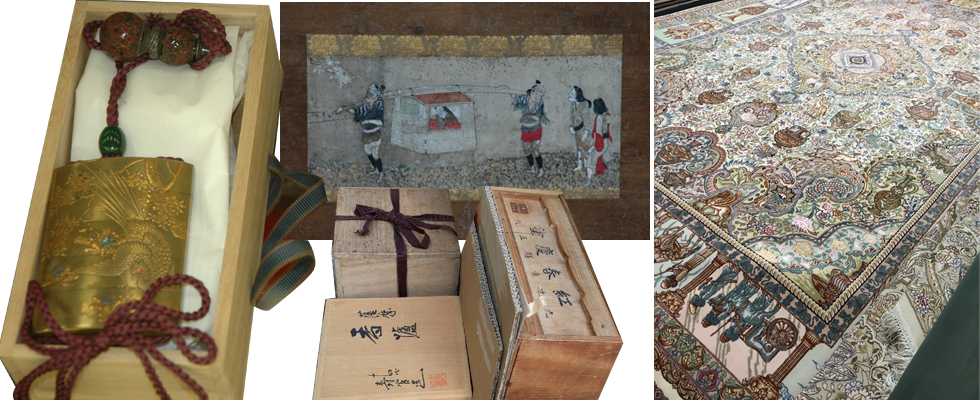 骨董品、美術品 、古美術品、中国骨董品、中国美術品、古道具、茶道具、書道具、香木、香道具、珊瑚、絵画、油絵、日本画、陶器、茶碗、西洋骨董品、西洋美術品、西洋古美術品、西洋絵画、人形、ブロンズ、曼荼羅(マンダラ)、仏画(チベット・インド)、着物(着物・帯・反物・帯留め)、和楽器 (三味線・お琴・琵琶・フルート・弓)等
